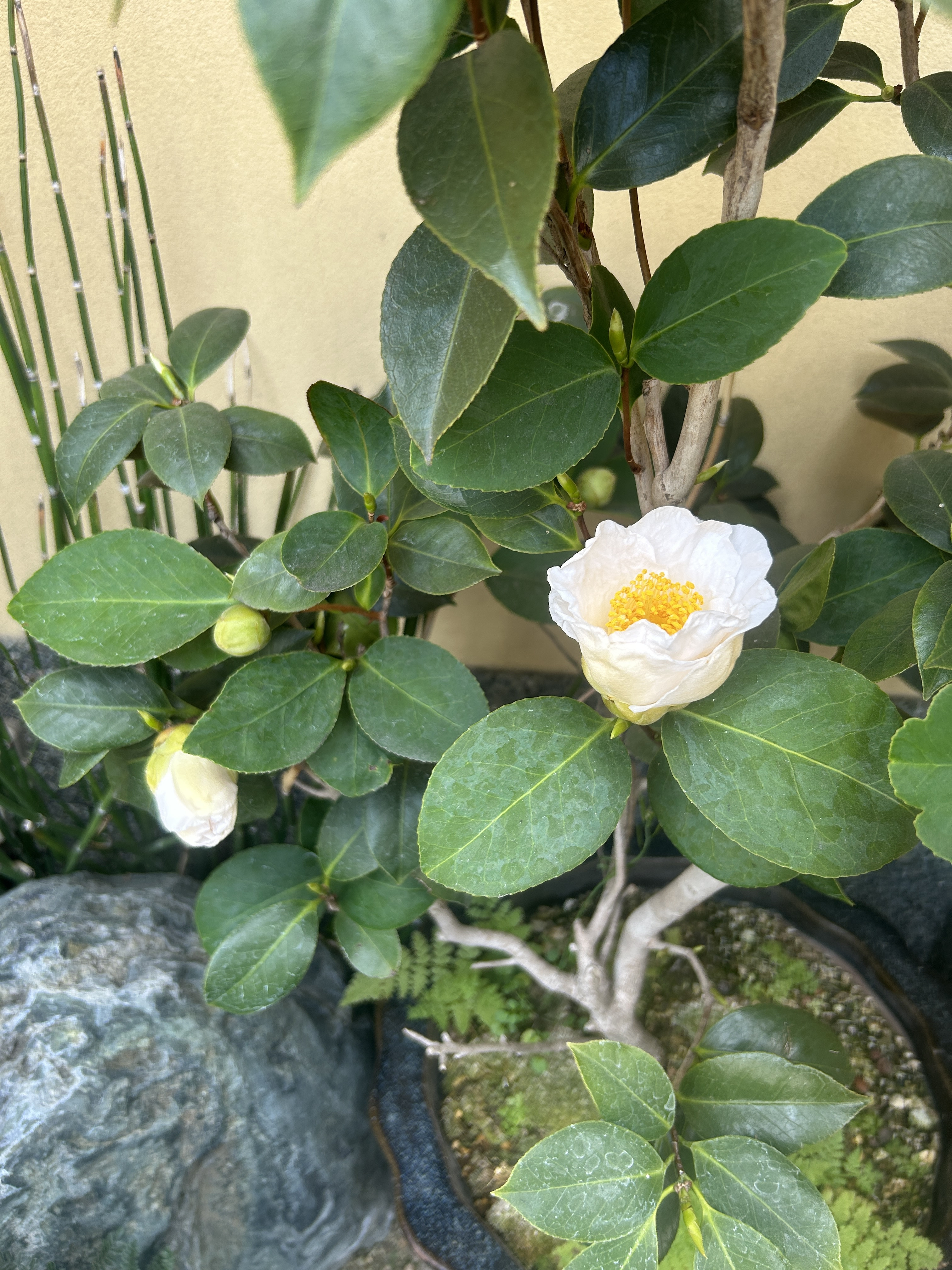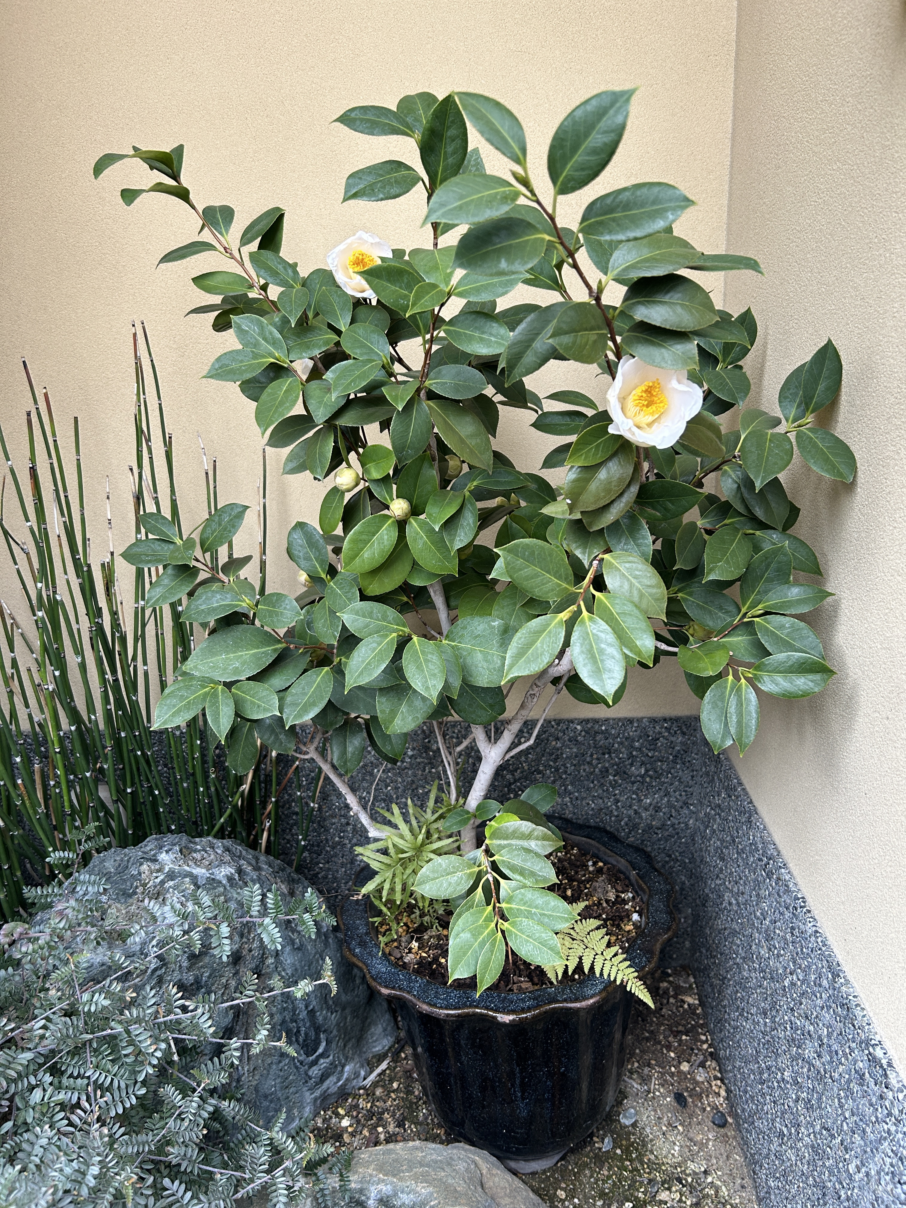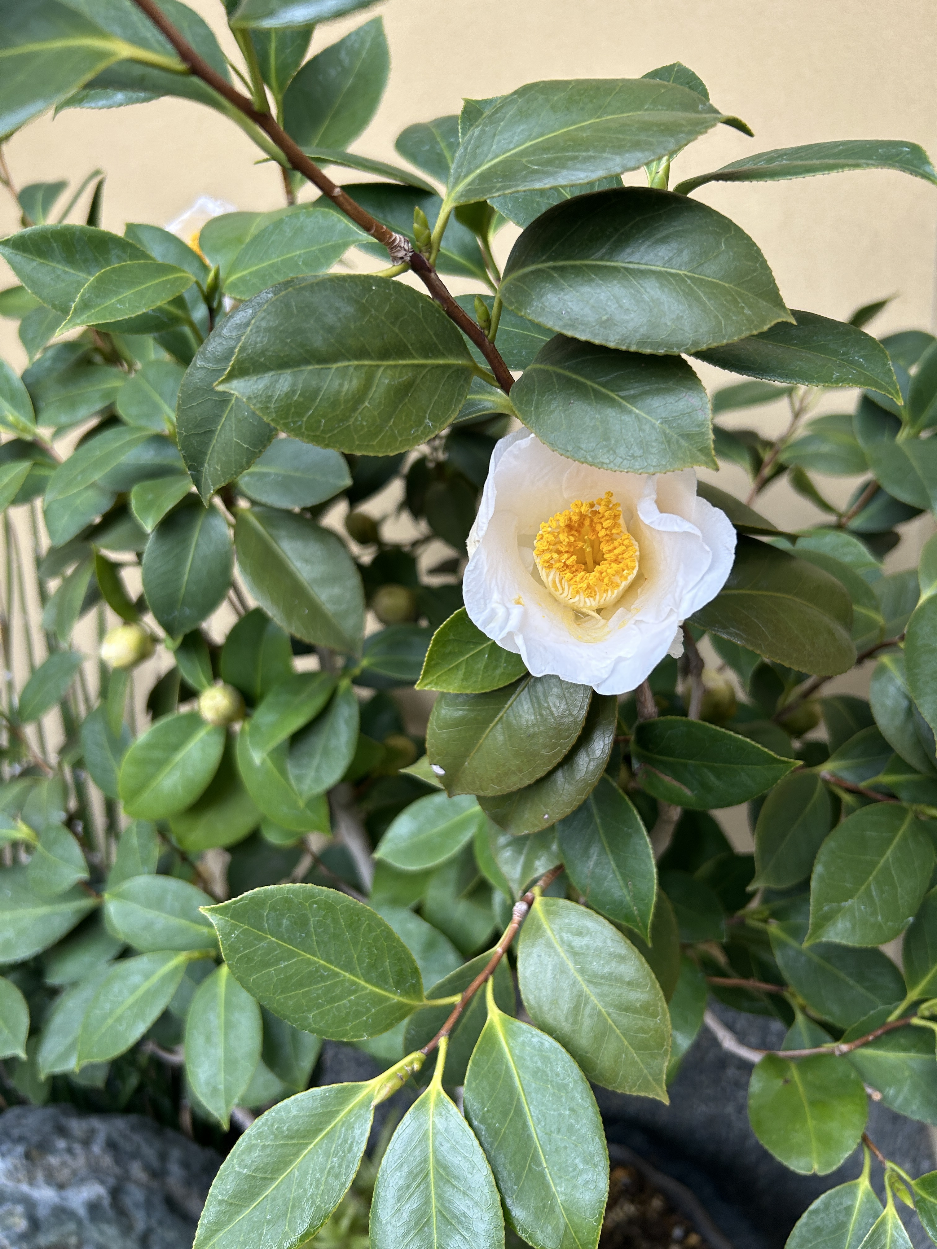 そういえば、玄関の植え込みに置いてある椿がようやく咲きました。